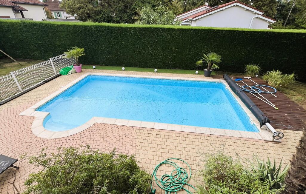 Extérieur, jardin, jeux de boule, très belle piscine.