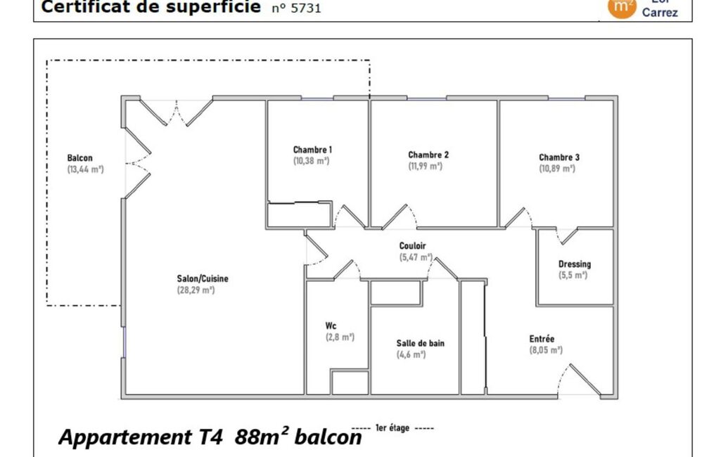 Entre Lentilly et Fleurieux. Au sein d'une résidence récente sur de Lentilly. Jolie T4 de 88m2 agencé de la façon suivante: une entrée, 3 chambres, une salle de bains et un WC séparé et un séjour/cuisine donnant sur le balcon 13.44m².