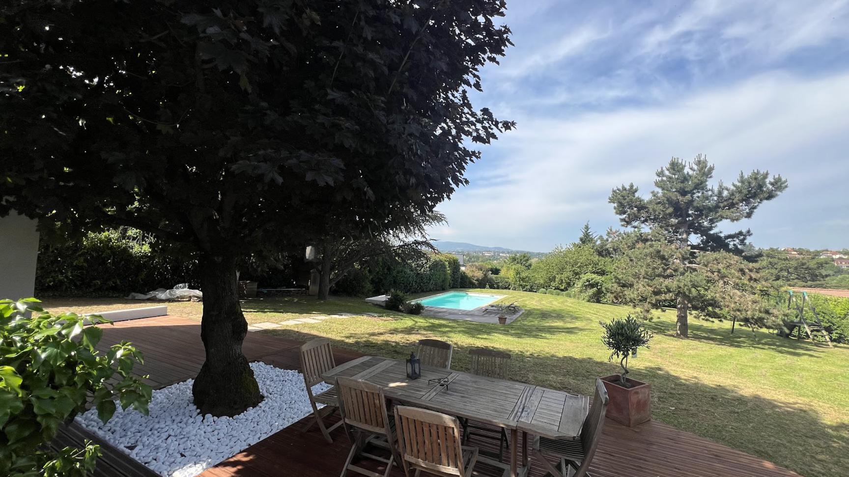 Terrasse en bois exotique avec vue dégagée sur les monts du Lyonnais.