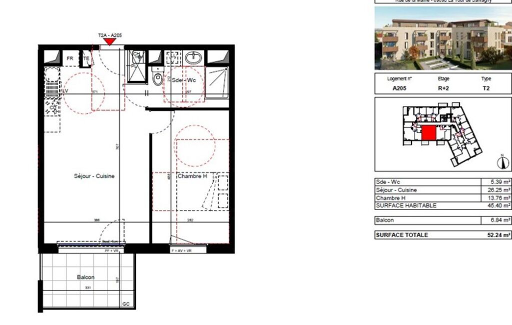 Appartement T2 Neuf de 45.4m² avec balcon 7m². Etage 2éme Ascenseur.