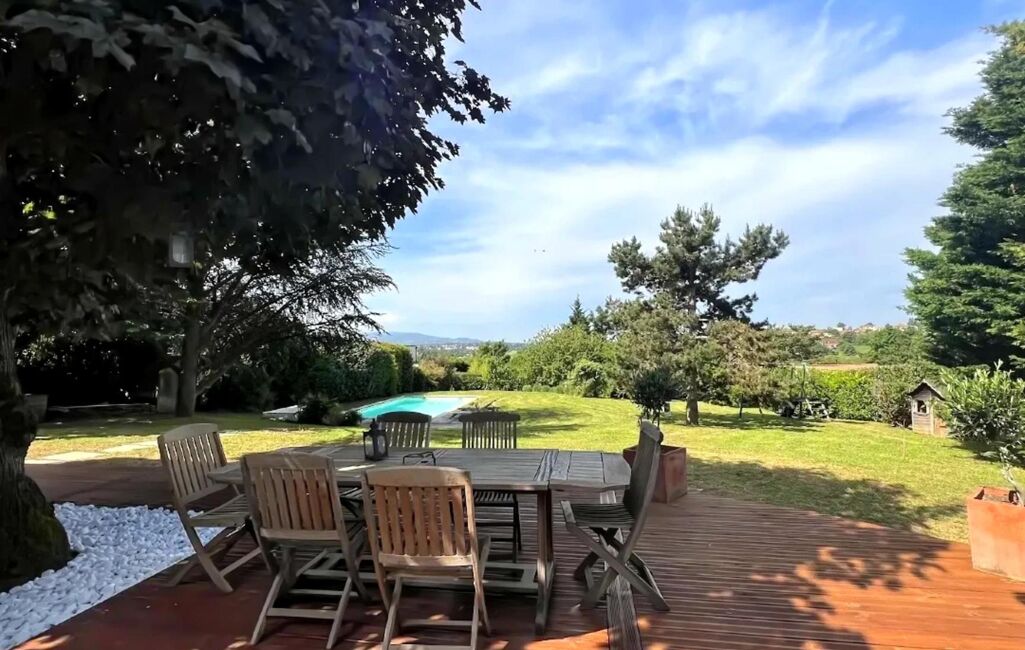 Terrasse en bois exotique avec vue dégagée sur les monts du Lyonnais.