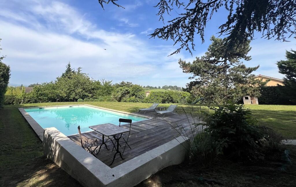 Terrasse en bois exotique avec vue dégagée sur les monts du Lyonnais.