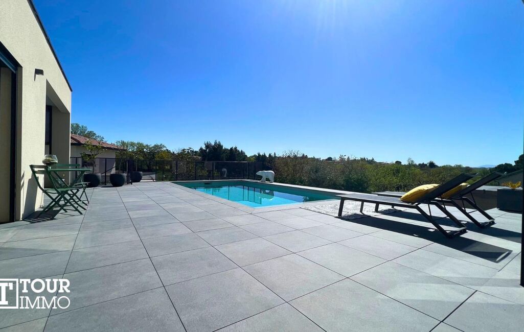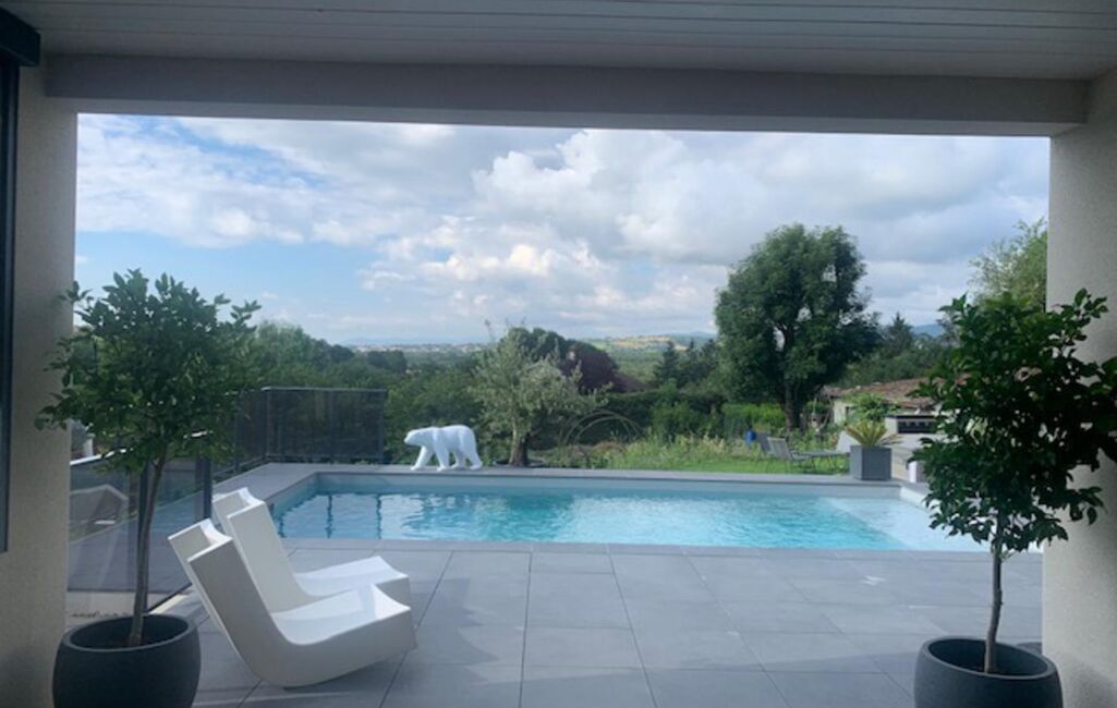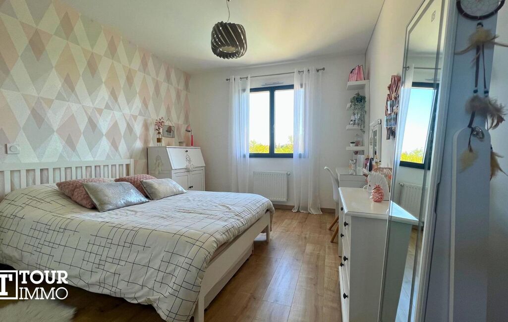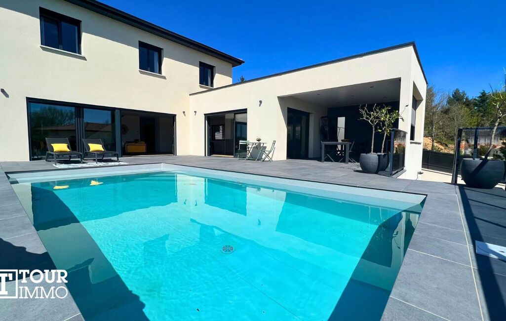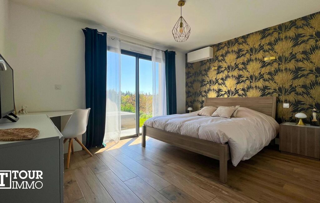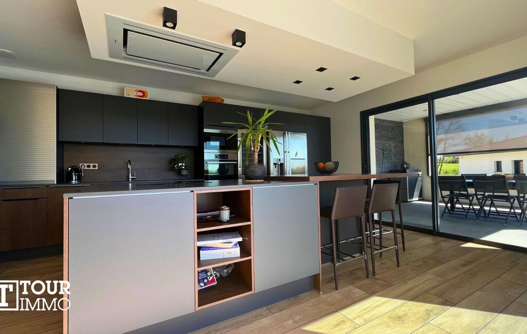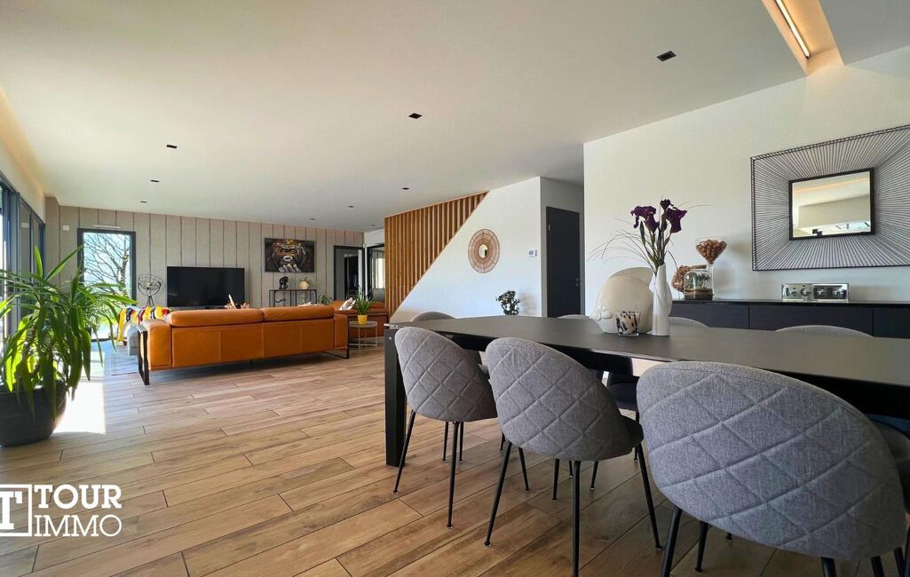 Villa contemporaine sur 2 niveaux + sous-sol. Rez-de-chaussée, hall, toilettes séparés, lingerie, accès à un garage double isolé avec prise recharge voiture électrique. Salon, séjour, ouvert sur une cuisine aménagée 95m² accès à une terrasse couverte et piscine, au même niveau vous avez la suite parentale 28m² (salle d’eau, dressing, WC) et un bureau.