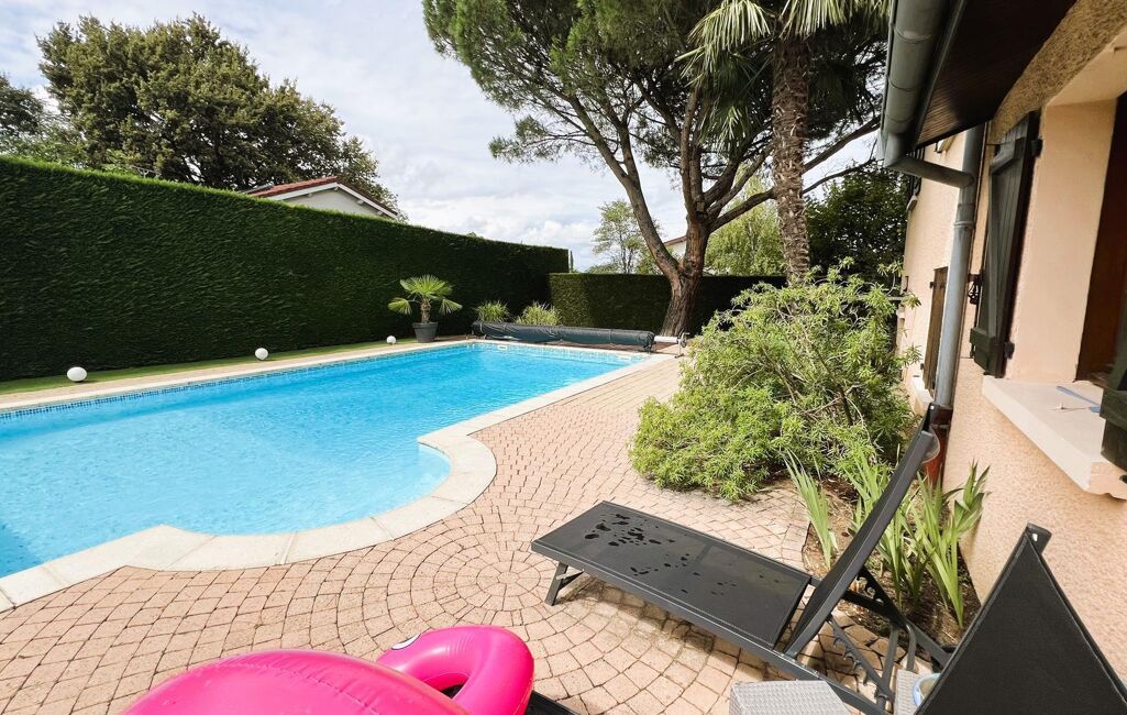 Extérieur, jardin, jeux de boule, très belle piscine.
